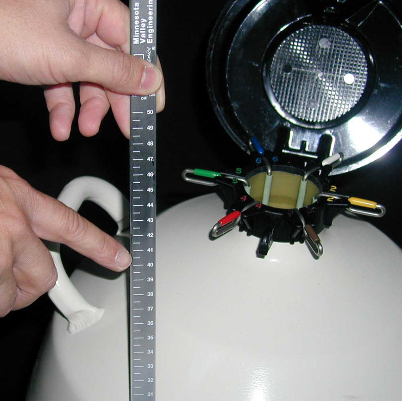 a)定期測(cè)量罐內(nèi)液氮的高度。不同的液氮罐因尺寸及使用頻率不同,罐內(nèi)液氮揮發(fā)速度也不同。液氮罐應(yīng)保持一周檢測(cè)一次,以便及時(shí)補(bǔ)充液氮。