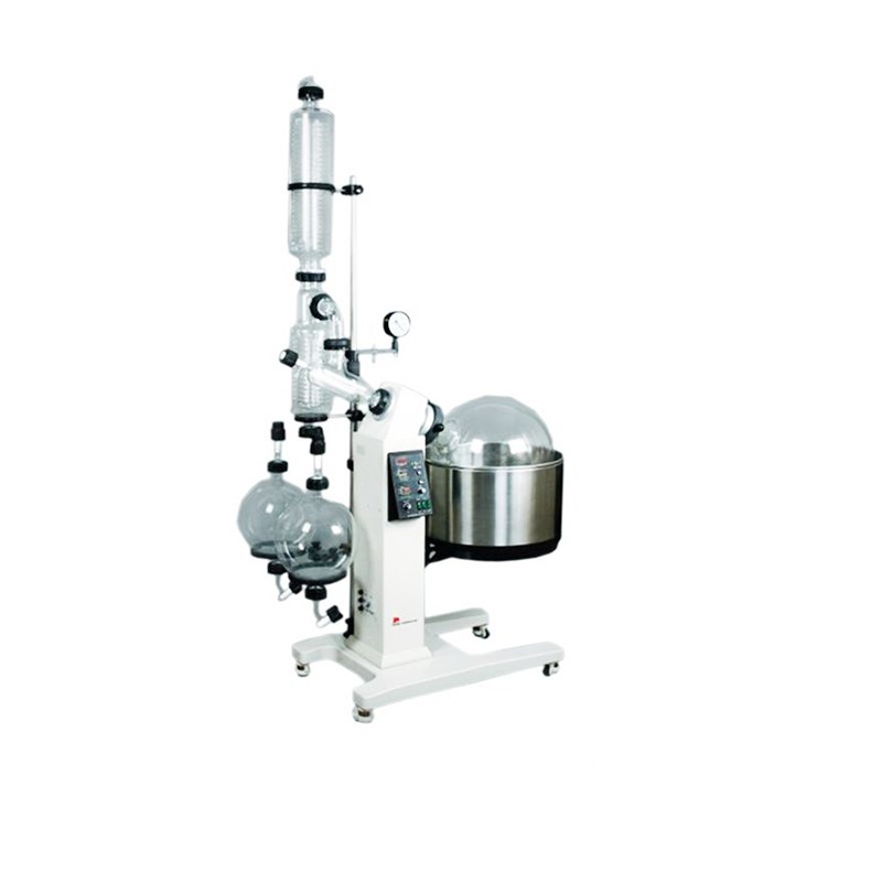 旋轉蒸發器是在真空負壓條件下,利用恒溫加熱,薄膜蒸發的原理研制而成。旋轉蒸發器用無級調速使玻璃旋轉瓶恒速旋轉,物料在瓶壁形成大面積均勻薄膜,再由智能恒溫水浴鍋對旋轉瓶均勻加熱,在真空條件下高速蒸發,溶媒蒸氣經高效玻璃冷凝器冷卻,回收于收集瓶。